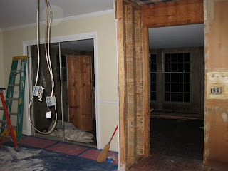 The above photos are the befores. It was right after we bought the house, before demo began and when we believed this project was not only completely doable but totally going to be worth it. On my optimistic mornings I still believe that but currently I question the rationale, especially as the baby kicks me. I believe her athletic future is great. Anyway, back to the photos. What you have is the way the kitchen looked when we purchased. It’s not the original kitchen- it was most likely redone in the 80s when some things were replaced in other parts of the house and then never touched again. But the concept fascinates me. Hopefully you can see that even the ceiling is wallpapered in blue gingham. The second photo is of the sunroom directly off the kitchen and dining room. Why, yes m’am, those ARE real Confederate bonds that are the backs of the shelves! Matt and I would be rolling in cash had the “Great Conflict” come to a different end. Of course if it had I highly doubt people would be wallpapering with bonds. So, we now have money in the walls. Really. Step one was to take out the wall between the kitchen and the dining room, and to change the layout of the kitchen- it had a really weird flow. So here’s what the kitchen looked like right after demo: